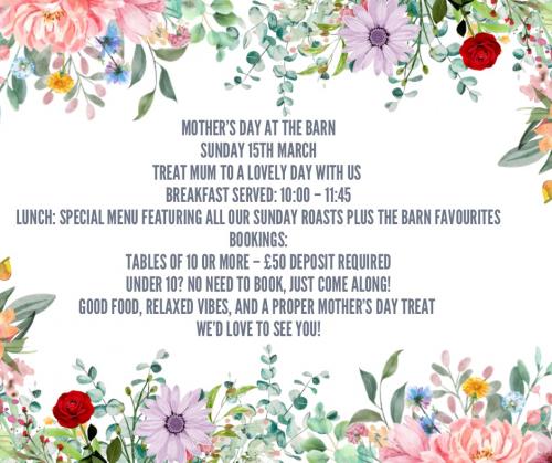 29th of January, 2026Mother's Day 2026 @ The Barn Please click on the attched link to see our special Mother's Day menu. Please note this will be the only menu after breakfast that we will be serving.